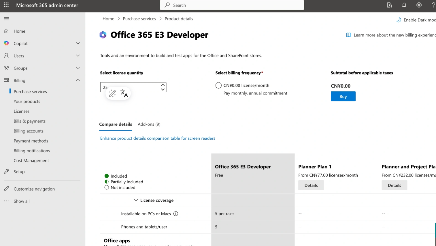 filter 过滤 e3 找到 Office 365 E3 Devloper.... 点Details